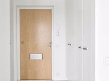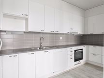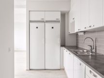 Asunnossa on tyylikkäät pääosin vaaleat materiaalit, mutta pientä särmää tuo kylpyhuoneen tehosteseinän tumma laatta ja harmaat keittiön välitilan laatat.
