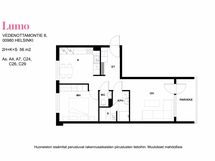 Tässä Lumo-kodissa on vaalea laminaattilattia ja maalatut seinät. Keittiössä on valkoiset kaapit ja sopiva paikka ruokapöydälle. Keittössä on liitännät astianpesukoneelle Kylpyhuoneessa muovimatto ja seinät ovat laatoitettu valkoisella laatalla, pyykinpesukoneelle löytyy liitännät. Arjen luksusta tuovat näppärä sauna ja oma parveke.