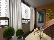 Lasitettu parveke avautuu kävelykadulle ja tarjoaa viihtyisää lisätilaa keväästä pitkälle syksyyn – ihanteellinen paikka nauttia ulkoilmasta omassa rauhassa.