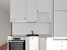 Hyvin varusteltu keittiö on suunniteltu helppoon arkeen: asunnosta löytyy valmiina integroitu astianpesukone, induktioliesi, erillisuuni sekä jenkkikaappi. Keittiöissä on myös mikrovaraus. Valkoiset keittiökaapit tuovat valoisuutta ja laadukkaat pintamateriaalit, kuten valkoinen välitilan laminaatti sekä lämpimän tammen sävyinen keittiötaso tekevät ruoanlaitosta sujuvaa ja mukavaa.