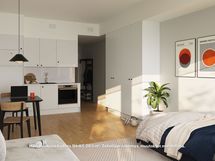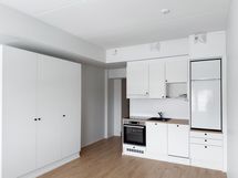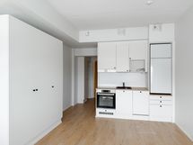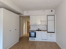 Tämä ihastuttava, yksiö on täydellinen yhdelle hengelle. Pieneen kotiin on saatu mahtumaan kaikki tarpeellinen, ottamatta mitään ylimääräistä. Kodin pohja on selkeä ja toimiva, jossa huonekalut löytävät helposti oman paikkansa! Keittiö on avoin olohuoneeseen, mikä tuo kivasti avaruutta ja tilan tuntua.Hyvin varusteltu keittiö on suunniteltu helppoon arkeen: asunnosta löytyy valmiina integroitu astianpesukone, induktioliesi, erillisuuni sekä jenkkikaappi. Keittiöissä on myös mikrovaraus. Valkoiset keittiökaapit tuovat valoisuutta ja laadukkaat pintamateriaalit, kuten valkoinen välitilan laminaatti sekä lämpimän tammen sävyinen keittiötaso tekevät ruoanlaitosta sujuvaa ja mukavaa.