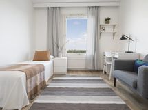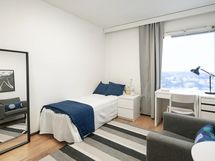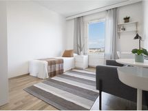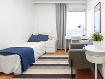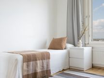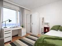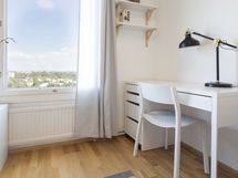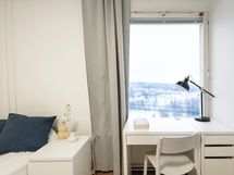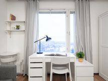 Stylish, furnished rooms in a renovated building in Pasila, on the 11th floor with amazing views. This rooms has Nordic-style furniture, everything you need for a comfortable daily life: a bed, night table, desk space, chair, lamp, wardrobes, window blinders & curtains, and bedlinen – you will have less to worry, and you can focus on getting the most out of your stay!