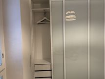 Makuuhuoneessa on tilavat vaatekaapit ja huoneeseen mahtuu hyvin iso sänky.