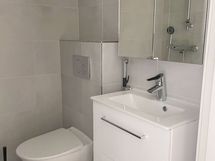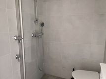 Kylpyhuone on laatoitettu kauttaaltaan graniitin harmaalla laatalla. Lattia laattaa on kooltaan pienempää ja seinissä isompi laatta. Tyylikkäät kylpyhuone kalusteet sinetöivät kokonaisuuden.
