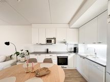 Asunnossa on toimiva pohjaratkaisu, jossa avokeittiö sulautuu kauniisti olohuoneeseen luoden avaran ja yhtenäisen oleskelutilan. Keittiössä on astianpesukone ja hyvin kaappitilaa, ja ruokapöytä mahtuu tilaan vaivattomasti. Olohuoneesta avautuu kulku lasitetulle parvekkeelle, jonka voi sisustaa viihtyisäksi oleskelutilaksi – kuin yhdeksi lisähuoneeksi. Parvekkeelta aukeavat avarat näkymät.