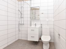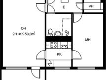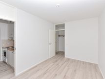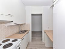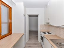Keittiö on toimivapohjainen ja sinne pääsee sekä makuuhuoneesta että olohuoneesta. Tämä asunto sopii hyvin siis kimppakämpäksi.