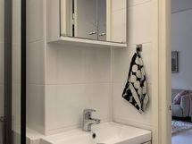 Pohjapiirrustus on suuntaa antava ja tästä poiketen vaatekaappi on sijoitettu toisinpäin, niin että kaappi avautuu eteiseen.