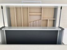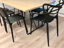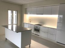 - Jää-pakastinkaappi, Liesituuletin, Liesi tai uuni erikseen, Induktioliesi, Astianpesukone, Integroidut koneet, Kivitasot, Suuri tiskipöytä, Paljon työskentelytilaa, Paljon kaappitilaa, Tilaa isolle ruokapöydälle, Kaapistojen välitilaan asennetaan vielä taidelasi