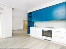 Modernin kodin lattiat ovat laminaattia. Keittiön alakaappien ja korkeiden kaappien ovet ovat valkoiset ja yläkaappien ovet ja avohyllyköt ovat petroolin siniset. Työtasot ovat valkoista laminaattia ja ylä- ja alakaappien välinen tila on laatoitettu lasimosaiikkilaatoilla. Keittiön varusteena on keraaminen liesitaso ja kalusteuuni, liesikupu, jää-pakastinkaappi, astianpesukone ja tilavaraus mikroaaltouunille. Kodinkoneet ovat valkoisia.