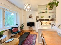 Kiva kaksio, jossa makuuhuoneeseen mahtuu muutakin sänky ja olohuone ja keittiö yhdistyvät kivasti toisiinsa. Keittiössä on valmiina astianpesukone arkea helpottamassa. Kylpyhuoneeseen mahtuu pyykinpesukone.