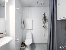 - Pesutilojen kuvaus: VARUSTUS: Hana, allas, peilikaappi, allaskaappi, wc, bidee-suihku, suihku, suihkuverhotanko, sauna, pesukoneliitäntä.
