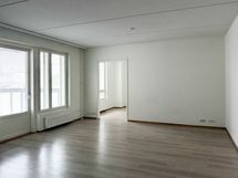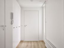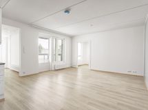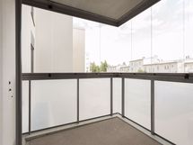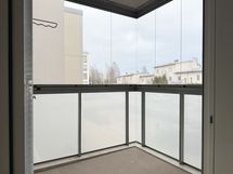 Asunnon lattiat ovat vaaleanharmaata laminaattia ja seinät maalatut. Lasitetulla parvekkeella voit seurata talon sisäpihan elämää ja samalla nauttia olostasi rauhallisen kulmaparvekkeen suojassa.