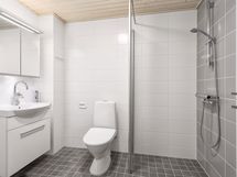 Pesuhuoneessa, joka laatoitettu valkoisella ja harmaalla laatalla, on tilavaraus pyykinpesukoneelle.