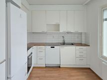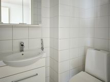 Lattiassa on tammilaminaatti ja seinät ovat maalatut. Valko-harmaalla sävyllä laatoitettuun kylpyhuoneeseen saa asennettua pyykinpesukoneen. Erillisessä wc:ssä on harmaa laatta lattiassa ja valkoiseksi maalatut seinät. Keittiössä on valkoiset kaapit metallivetimin, valkoinen välitilan laatta ja laminaatin sävyiset tasot. Astianpesukone kuuluu keittiön varusteisiin.