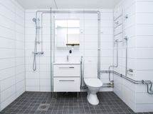 Seinälaatoitetussa, tilavassa kylpyhuoneessa on pesukonevaraus.