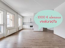 KAMPANJA: Uusiin vuokrasopimuksiin -1000€ vuokra-alennus ensimmäisestä täyden kuun vuokrasta, kun sopimus alkaa viimeistään 29.4.2026. Sopimukseen sitouduttava vuodeksi. Mikäli sopimus irtisanotaan ennen ensimmäistä mahdollista irtisanomispäivää, tulee maksettavaksi 1 kk vuokraa vastaava sakko. Kampanjoiden yhteydessä vakuus vain 350€. Asunto on mahdollista vuokrata myös ilman kampanjaa.