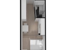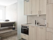 Tässä kevyesti kalustetussa studiossa on valmiina sänky, pöytä ja tuolit, kaapit, valaistus, perustasoiset keittiökoneet ja pyykinpesukone. Voit luoda tilaan persoonallisen sisustuksen omilla huonekaluilla. Studio on lemmikkiystävällinen.