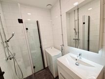 - Suihkuseinä, Suihku, Pesukone, Pesukonevalmius, Allaskaappi, Peilikaappi, Rättipatteri, Laattaseinä, Laattalattia, Lattialämmitys