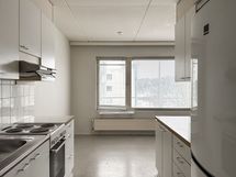 Asunnossa on vaaleanharmaa muovimattolattia ja maalatut seinät. Olohuoneessa ja makuuhuoneessa on kukallinen tehostetapetti. Keittiössä on valkoiset kaapit metallivetimin, valkoinen välitilan laatta sekä tasot. Astianpesukoneelle on liitännät. Erillinen kylpyhuone on sisustettu mustalla massalattialla ja valkoisilla seinälaatoilla. Pesukoneelle löytyy liitäntä. Wc:ssä on harmaa laattalattia ja valkoisella maalatut seinät.