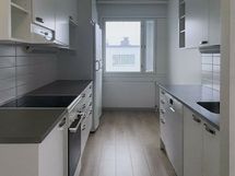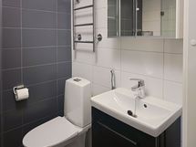 Kodissa on vaalean tammen sävyiset laminaattilattiat ja seinät ovat maalatut. Vaaleassa keittiössä on valkoiset kaapinovet ja työtaso on harmaa. Keittiö on varusteltu erillisillä täysikorkeilla jää-viileäkaapilla ja pakastimella, keraamisella liedellä sekä astianpesukoneella. Mikroaaltouunille on tilavaraus. Kylpyhuone on laatoitettu ja värimaailmaltaan valko-harmaa. Pyykinpesukoneelle on liitännät ja tilavaraus.