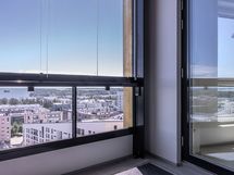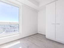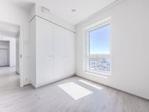 10. kerroksen saunallinen kolmio lasitetulla parvekkeella. Avokeittiö, joka avautuu olohuoneeseen. Makuuhuoneissa kaapistot.