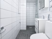 Arjen varma piristys on uutuuttaan hohtava kotikylpylä, jonka seinät ovat valkoista ja lattia harmaata laattaa. Tehopohjaisessa kylpyhuoneessa on tilaa myös pyykkikoneellesi.