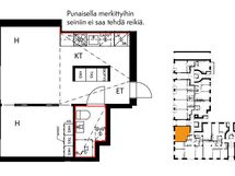 Tehopohjaisen asunnon ikkunat avautuvat luoteeseen Castréninkadulle. Näppärä keittiö on sopivasti hieman erillään oleskelutilasta, silti samaa, yhtenäistä tilaa. Makuuhuoneessa on tilaa vaatesäilytykselle, reilun kokoiselle vuoteelle ja vaikka pienelle lukunurkkaukselle. Olohuoneen ja makuuhuoneen välillä on kätevät liukuovet.