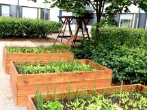 - Pihalla on kaupunkiviljelylaatikoita, puutarhakeinu ja lasten leikkipaikka.