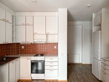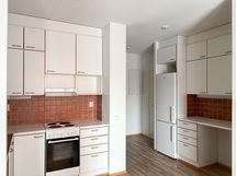 Huoneiston seinät on maalattu valkoiseksi. Keittiössä on jää-pakastinkaappi tai jää-viileäkaappi, 4-levynen liesi, varaus astianpesukoneelle ja paikka mikroaaltouunille.