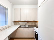 Kompaktiin keittiöön tuo ikkuna valoa kivasti ja siellä on kokkailu- tai kahvihetkiä varten kätevä työtaso. Tämän kodin kruunaa koko asunnon levyinen lasitettu parveke.