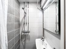 Kylpyhuoneessa on tilaa suihkulle ja arkea helpottaa keittiön oma pyykinpesukone. Ikkunat avautuvat rauhalliselle sisäpihalle lounaaseen.