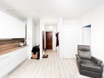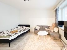Olohuone ja avokeittiö yhdistyvät saumattomasti toisiinsa. Kauniissa keittiössä on mm. astianpesukone ja integroitu mikroaaltouuni valmiina. Tilaan mahtuu niin ruokapöytä kuin sohvakin, mutta sohvan voi sijoittaa halutessaan myös pariovien kautta mentävään todella tilavaan makuuhuoneeseen. Asunnossa on neljä komeroa, jossa on säilytystilaa.