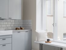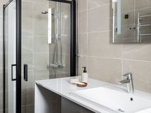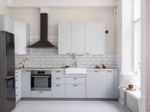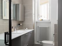 Moderni ja hillitty avokeittiö kvartsitasoineen istuu tyylikkyydellään täydellisesti tähän arvoasuntoon ja pitää sisällään runsaasti kaappitilaa. Sama moderni tyylikkyys on nähtävissä myös kylpyhuoneessa. Suunnittelusta on vastannut sisustusarkkitehtitoimisto Kakadu Oy ja juuri valmistunut täydellinen huoneistoremontti on pieteetillä toteutettu.