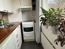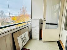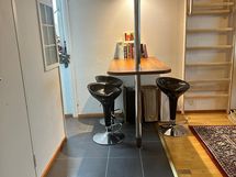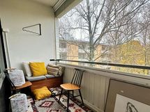 This charming 28 m² top-floor corner studio features a spacious south-facing glass-covered balcony, a sunny main room, a modern bathroom with shower and washing machine, a walk-in closet, and a fully equipped kitchenette. The apartment was partly renovated in 2025, including a brand-new bathroom. New furniture includes a 140 cm wide double bed with mattress, a small sofa bed, side tables, bar counter chairs, a cozy, woolen carpet and laundry machine. The apartment has wooden floors, and tiled surfaces in the kitchen and entrance hall. Kitchenware, microwave, vacuum cleaner, ironing board and other essentials are all provided.