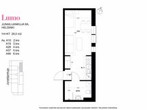 Tämän yksiön eteisestä on suora kulku käytävälle, jonka varrelle keittiötila on sijoitettu. Keittiö ei vie seinätilaa huoneen puolelta, mikä tuo lisää mahdollisuuksia huonetilan sisustamiseen. Kylpyhuone jää eteisen oikealle puolelle. Kodissa on kaunis, vaalea värimaailma. Ranskalaiselta parvekkeelta on maisemat kohti talon sisäpihaa. Kylpyhuoneessa on loistavasti tilaa yksin asuvan tarpeisiin.