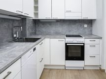 Erillisessä keittiötilassa mahtuu kokkailemaan ja sinne sopii myös pieni ruokapöytä. Linjakkaat keittiökaapistot ovat valkoisia ja niiden pinta mukailee puun kuvioita. Ylä- ja alakaappien välinen tila ja työtaso ovat harmaata laminaattia. Varustukseen kuuluu keraaminen liesi, liesikupu, astianpesukone ja jääkaappipakastin. Kodinkoneet ovat valkoisia.