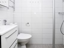 Kylpyhuoneessa on valkoiset Kide-malliston kotimaiset kalusteet. Seinät ovat valkoista laattaa ja lattia on harmaa. Tilassa on varaus kapealle pyykinpesukoneelle.
