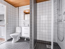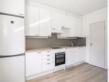 Kodissa on kaunis laminaattilattia ja seinät ovat maalatut. Keittiössä on valkoiset kaapistot metallivetimillä ja vaalean puun sävyiset työasot. Ajattomilla, valkoisella ja harmaalla sävyllä laatoitetussa kylpyhuoneessa on allaskaappi.