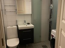 Suihku, pesukonevalmius, peilikaappi, allaskaappi, rättipatteri, laattalattia, laattaseinä