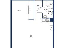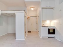 - Suihku, Suihkuseinä, Pesukonevalmius, Peilikaappi, Rättipatteri, Kylpyhuoneeseen mahtuu 45 cm:n pesukone jolle liitännät valmiina