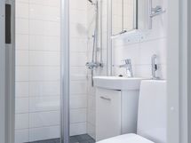 - Pesutilojen kuvaus: VARUSTUS: Suihku, suihkuseinä, peilikaappi, allas, allaskaappi, wc-istuin, bide-suihku, pyyhepatteri.