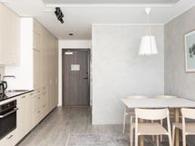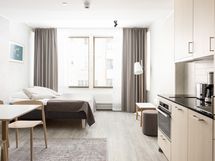 Tässä tyylikkäässä, täysin kalustetussa studiossa on valmiina sänky, pöytä ja tuolit, säilytystilat, valaistus, perustasoiset kodinkoneet, tekstiilit ja kodin pienet käyttötavarat. Keittiön ja makuuhuoneen yhdistelmä kylpyhuoneella on funktionaalinen ja viihtyisä tila jossa voit rentoutua omassa rauhassa. Täältä löydät kaiken mitä tarvitset tunteaksesi olosi kotoisaksi. Studio on lemmikkiystävällinen.
