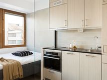 This lightly furnished studio comes with a 140cm bed, and a table and chairs in the living room. Cabinets, lighting, basic kitchen appliances and a washing machine are also included. You can personalise the space with your own furniture, textiles and decorative items.