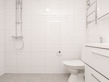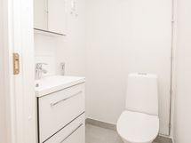 Olisiko tässä elämäsi uusi vuokrakoti? Kylpyhuoneessa ja erillisessä wc:ssä on valkoiset kotimaiset Kide-malliston kalusteet. Seinät ovat valkoista laattaa ja lattia on harmaa. Pyykinpesukoneelle löytyy oma paikka kylpyhuoneesta.