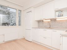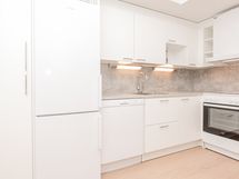 Erillisessä keittiössä kotikokki mahtuu puuhailemaan ja tilaan sopii myös kunnollinen ruokapöytä. Keittiön kaapistot ovat raikkaan valkoiset ja ylä- ja alakaappien välinen tila sekä työtaso ovat harmaata laminaattia. Varustukseen kuuluu keraaminen liesi, liesikupu, jääkaappipakastin ja astianpesukone. Kodinkoneet ovat valkoisia.
