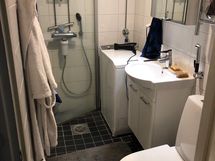 Suihkukaappi, Pesukone, Peilikaappi, Allaskaappi, Laattaseinä, Rättipatteri, Lattialämmitys
