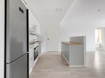 Asunnossa on laminaattilattiat, kylpytiloissa keraaminen laatta ja parveke on lasitettu. Olohuoneen yhteydessä on avokeittiö