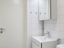 Raikkaassa kylpyhuoneessa on paikka ja liitännät pyykkikoneelle. Modernit, kotimaiset Kide-kylpyhuonekalusteet kestävät käytössä ja näyttävät hyvälle.
