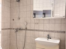 Kylpyhuone on laatoitettu, seinät vaaleaa laattaa ja lattia vaaleanharmaata laattaa. Pyykinpesukoneelle on liitännät.