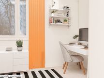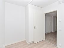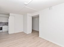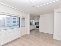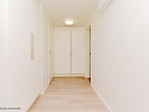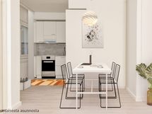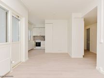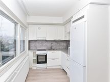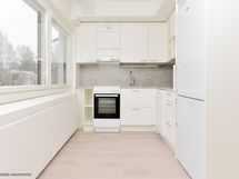 Kodin lattia on vaaleaa tammilaminaattia ja seinät on maalattu valkoisiksi. Olohuoneesta pääsee lasitetulle parvekkeelle. Tehokkaan keittiön kaapistot ovat raikkaan valkoiset ja ylä- ja alakaappien välinen tila sekä työtaso ovat harmaata laminaattia. Varustukseen kuuluu keraaminen liesi, liesikupu, jääkaappipakastin ja astianpesukone. Kodinkoneet ovat valkoisia.